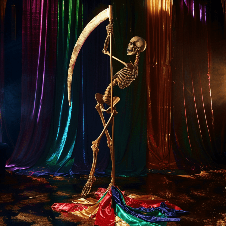 Un squelette portant une robe a capuche plutôt moulante de couleur violette se pavana sur scène sur fond d’un hymne funéraire entraînant à une cadence de 150 battements par minute, s’appuyant langoureusement à chaque pas sur une faux à manche fin et a la lame dorée. Arrivé au milieu de la scène, il posa le bout de sa faux devant lui et les mains sur le manche, et se mit a tourner autour de la faux. Après quelques tours, il prit un bout de sa robe et tira violemment : celui-ci se détacha et tomba par terre. En-dessous, il portait une robe plus moulante de couleur indigo. Il leva une jambe pour l’enrouler autour du manche de la faux, et se mit a faire des va-et-vient rythmique avec le torse. Sa robe semblait s’ouvrir et se détacher avec le mouvement, elle finit par tomber par terre, révélant une robe plus mourante et plus courte de couleur bleue en-dessous. Le squelette ôta ainsi plusieurs robes plus en plus courtes et de plus en plus moulante aux couleurs de l’arc-en-ciel, poursuivant ses manœuvres sensuelles autour de la faux : il l’étreignait fermement avec ses jambes et sautait de sorte à se retrouver le crâne en bas. A la fin, alors qu’il ne portait plus qu’une capuche rouge, le squelette se laissa tomber allègrement, se retrouvant assis sur les genoux, et, le crâne tourné vers le plafond, il arracha sa capuche avec son bras libre. Il tendit le bras tenant toujours la capuche, la lumière baissa et l’hymne était à peine audible sous le tonnerre des applaudissements.