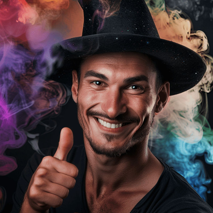 La boule montrait un humain à la mâchoire carrée qu’une majorité d’humaines et une minorité d’humains qualifieraient de très bel homme. Il portait un chapeau pointu de mage et son grand sourire révélait des dents blanches symétriques. Derrière lui, on voyait des fumées colorées flottantes.